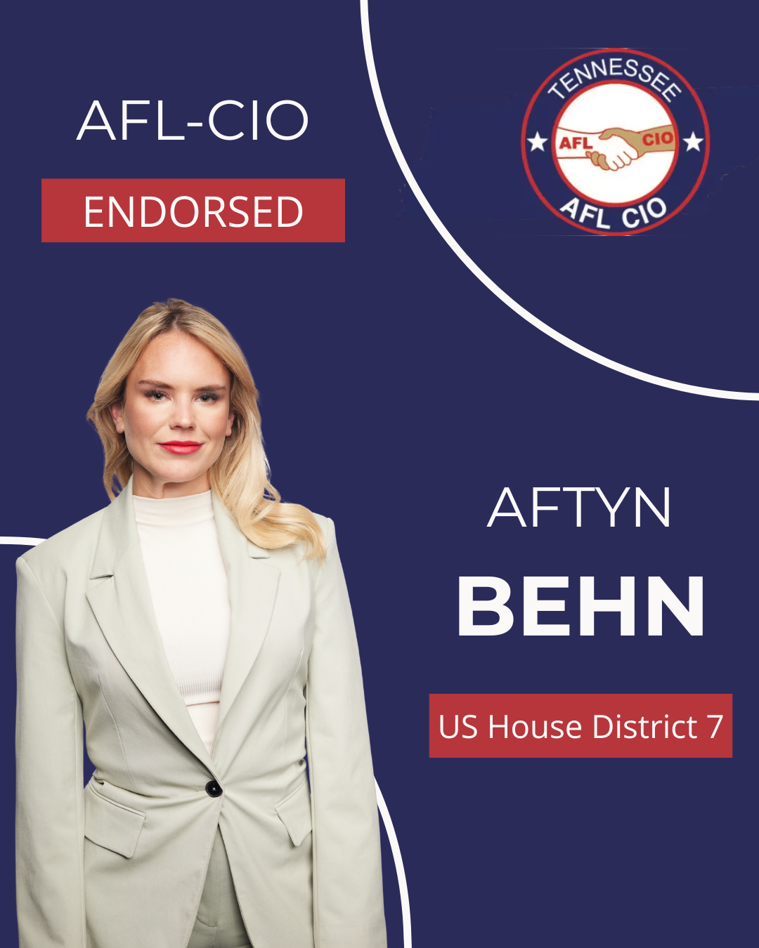 The Tennessee AFL-CIO Labor Council announced yesterday its official endorsement of Aftyn Behn for Congress in Tennessee's 7th Congressional District, citing her strong record of standing up for working people, fighting for fair wages and supporting the right to organize.